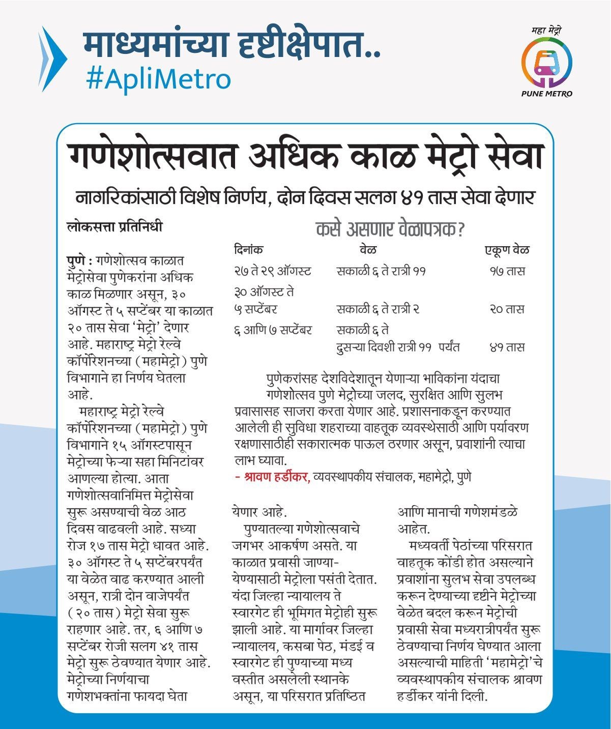 As per latest update by Shrawan Hardiker, Pune metro running timeline is extended for Ganesh bhakta travelling from all across city area. Maharashtra Metro Railway corporation has decided to extend metro timeline to 20 Hours on 30th August to 5th September.